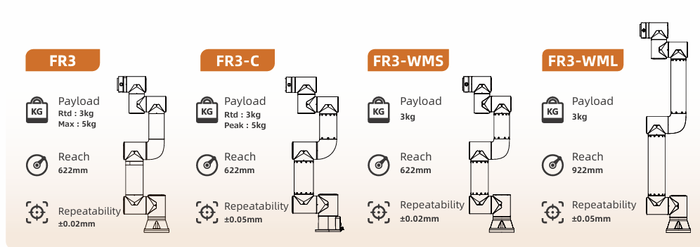 The Fairino FR3-WMS is part of the FR3 collaborative robot series and maintains a 3 kg payload and 622 mm working reach.